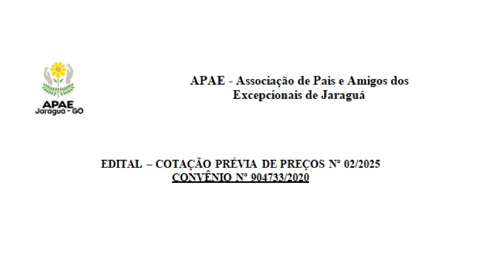 A Associação dos Pais e Amigos dos Excepcionais – APAE de Jaraguá, entidade sem fins lucrativos, inscrita no CNPJ n° 01.231.042/0001-04, situado na Rua das Parreiras nº 80, Quadra 80, Lote 01, Residencial Primavera, Jaraguá, Estado de Goiás, torna público para conhecimento dos interessados, aberta a realização da Cotação Prévia de Preços nº 01/2025, no âmbito do Convênio n° 907255/2020 celebrado com a União por intermédio do Ministério da Saúde e a Associação dos Pais e Amigos dos Excepcionais, que tem como objeto a aquisição de Equipamento e Material Permanente. A presente Cotação será executada obedecendo aos dispositivos do Decreto Federal nº. 6.170/2007, Portaria Interministerial MP/MF/CGU nº. 424/2016 e suas alterações.
